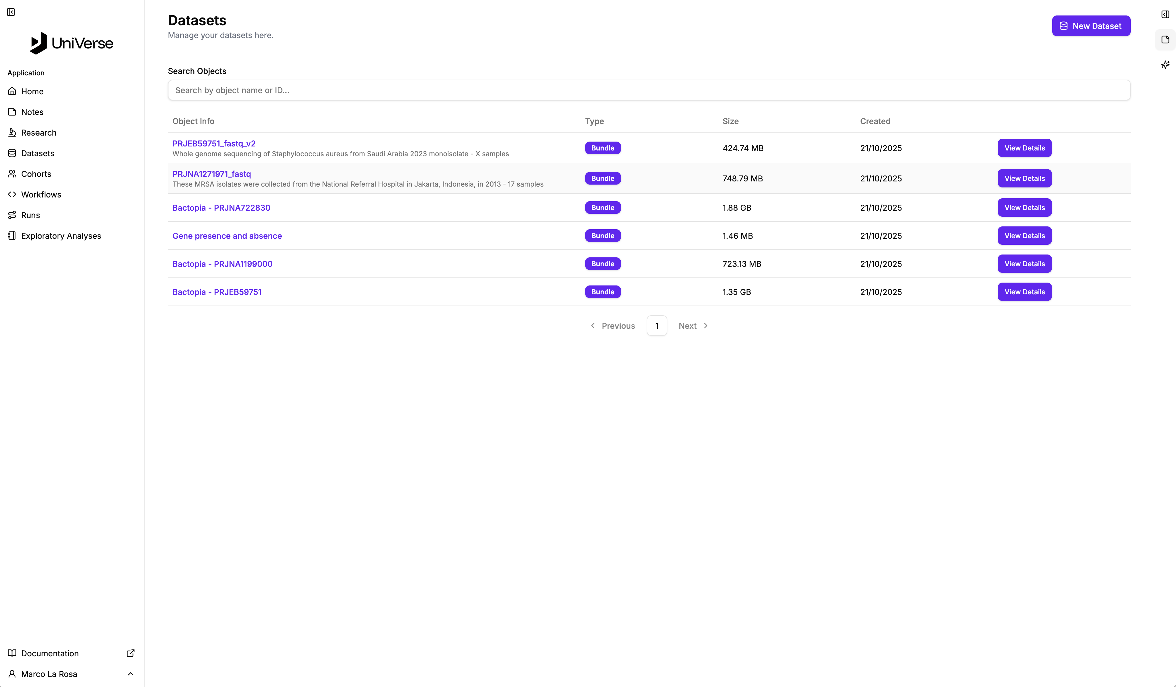 Scientific workflows require an input in the form of data. In the Datasets module you can upload the data you wish to process in the Platform.
