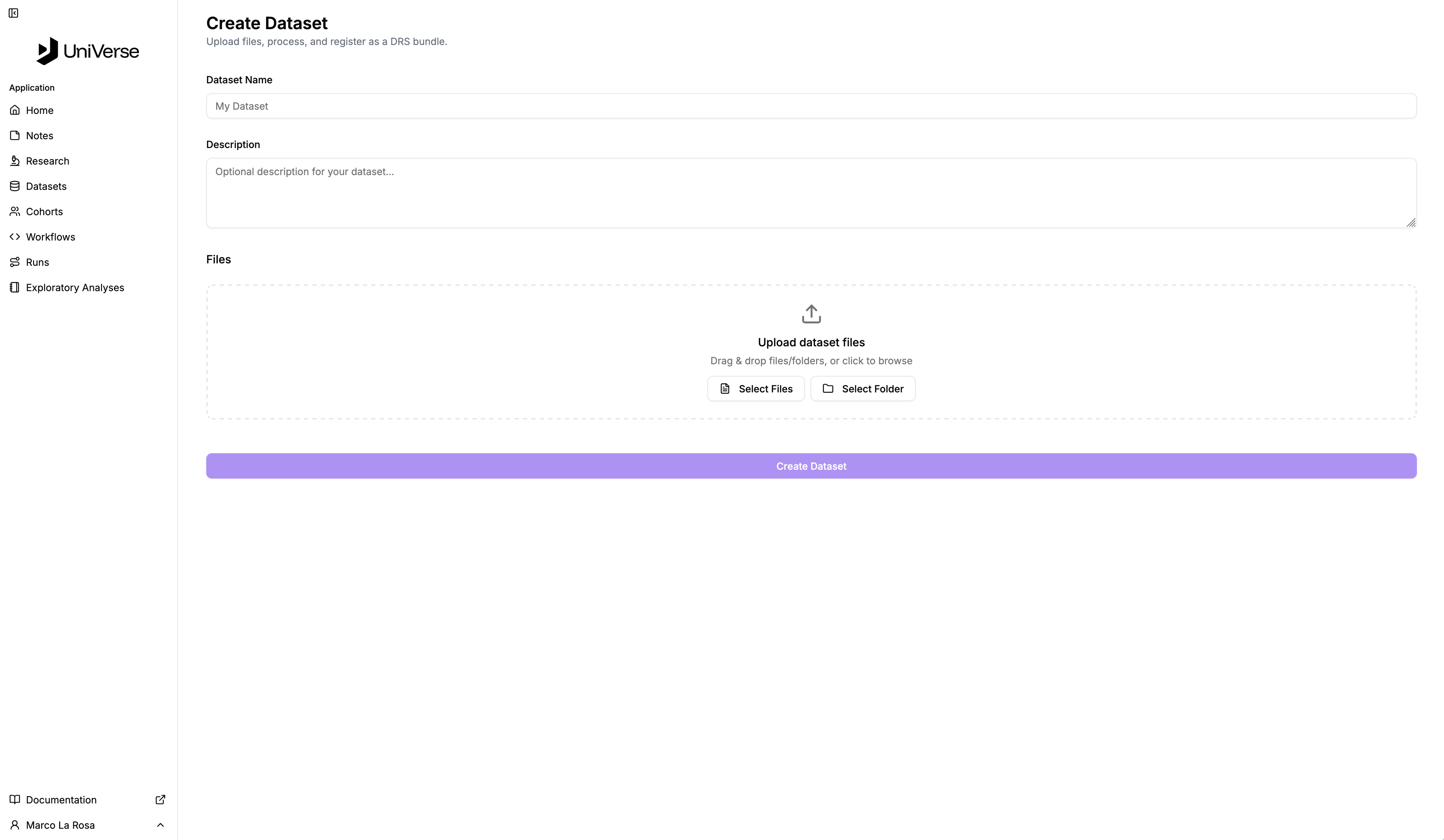 In this view provide a name and description for your datasets and select the files and / or folders of content you wish to upload to it. You can upload content from anything connected to your computer including data stored on shared resources like Google Drive or Dropbox.