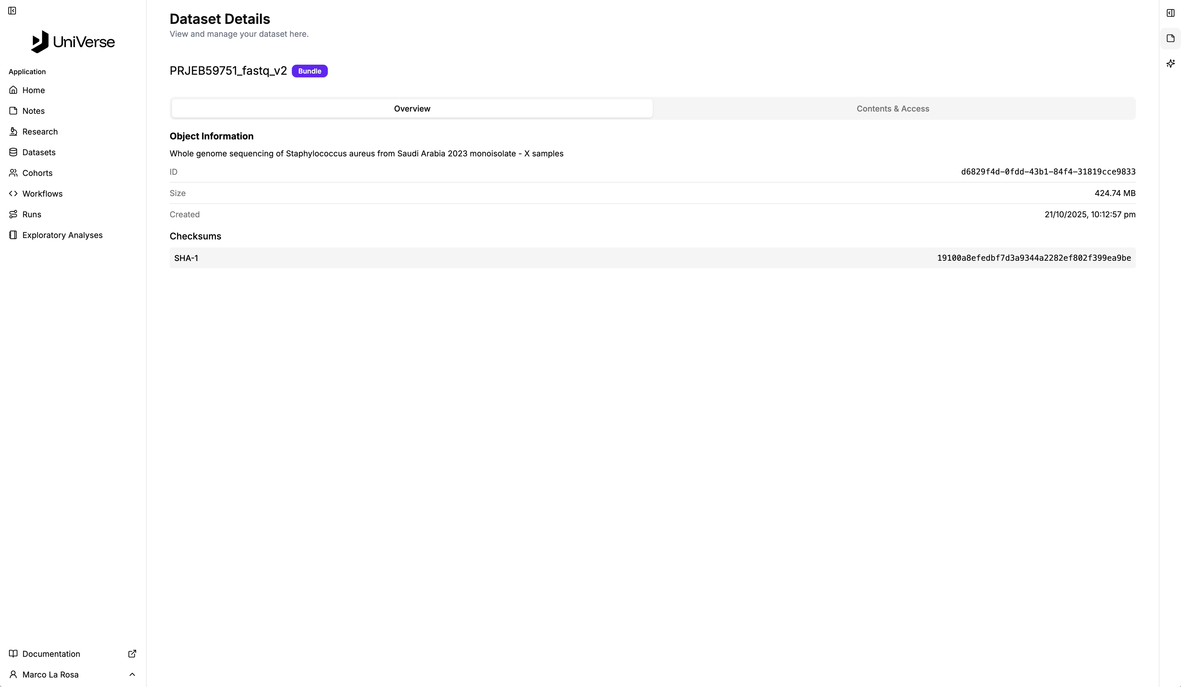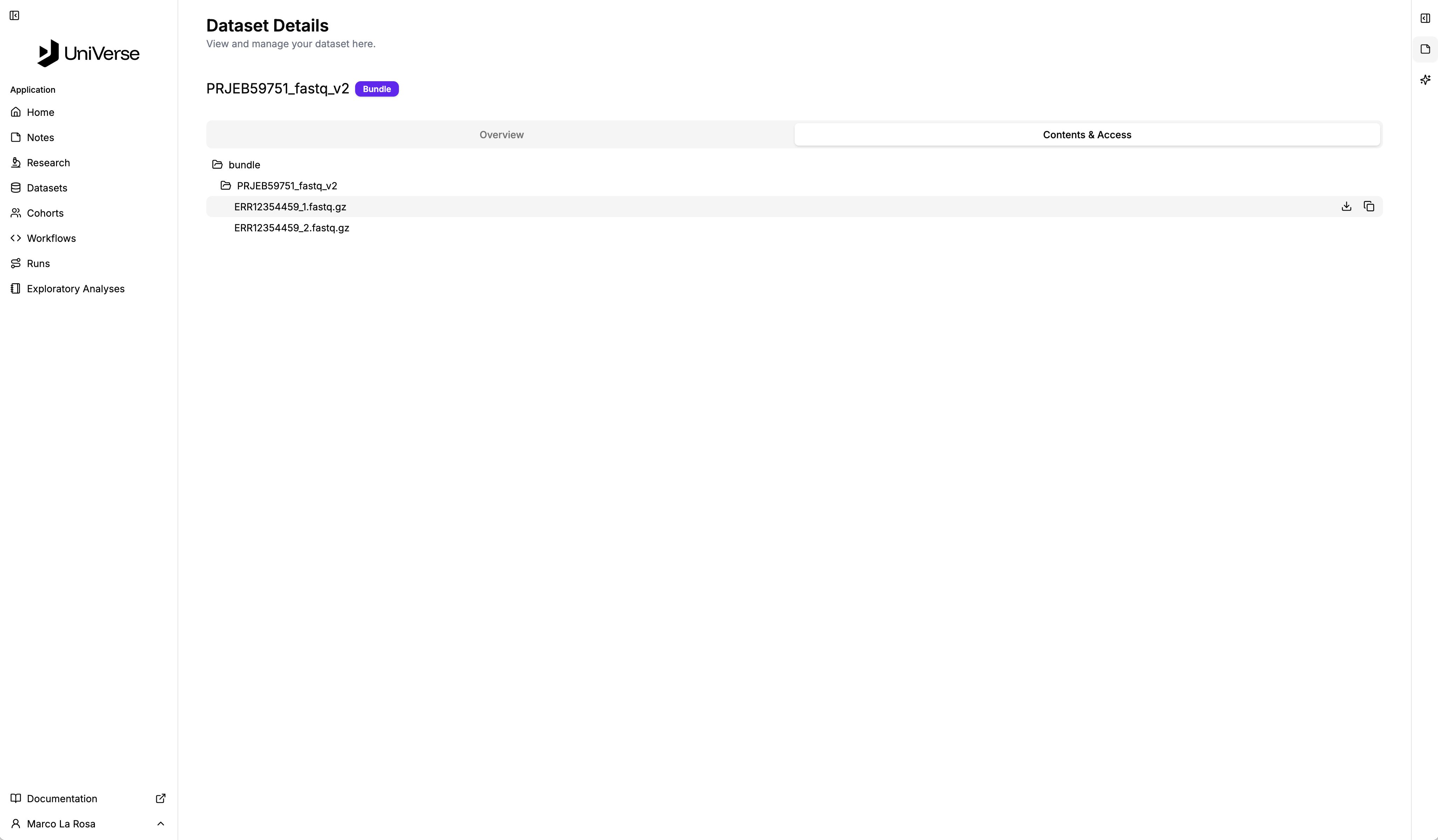 Then, when you select it, you will see the following content. In the first image there will be the metadata of the dataset including its ID, date and checksum (for verifying integrity) whilst the second shows the dataset contents. And when you hover over an individual file, you will see controls to download it (if you need to) and a copy icon which copies the URI to access it which is needed when creating a run.