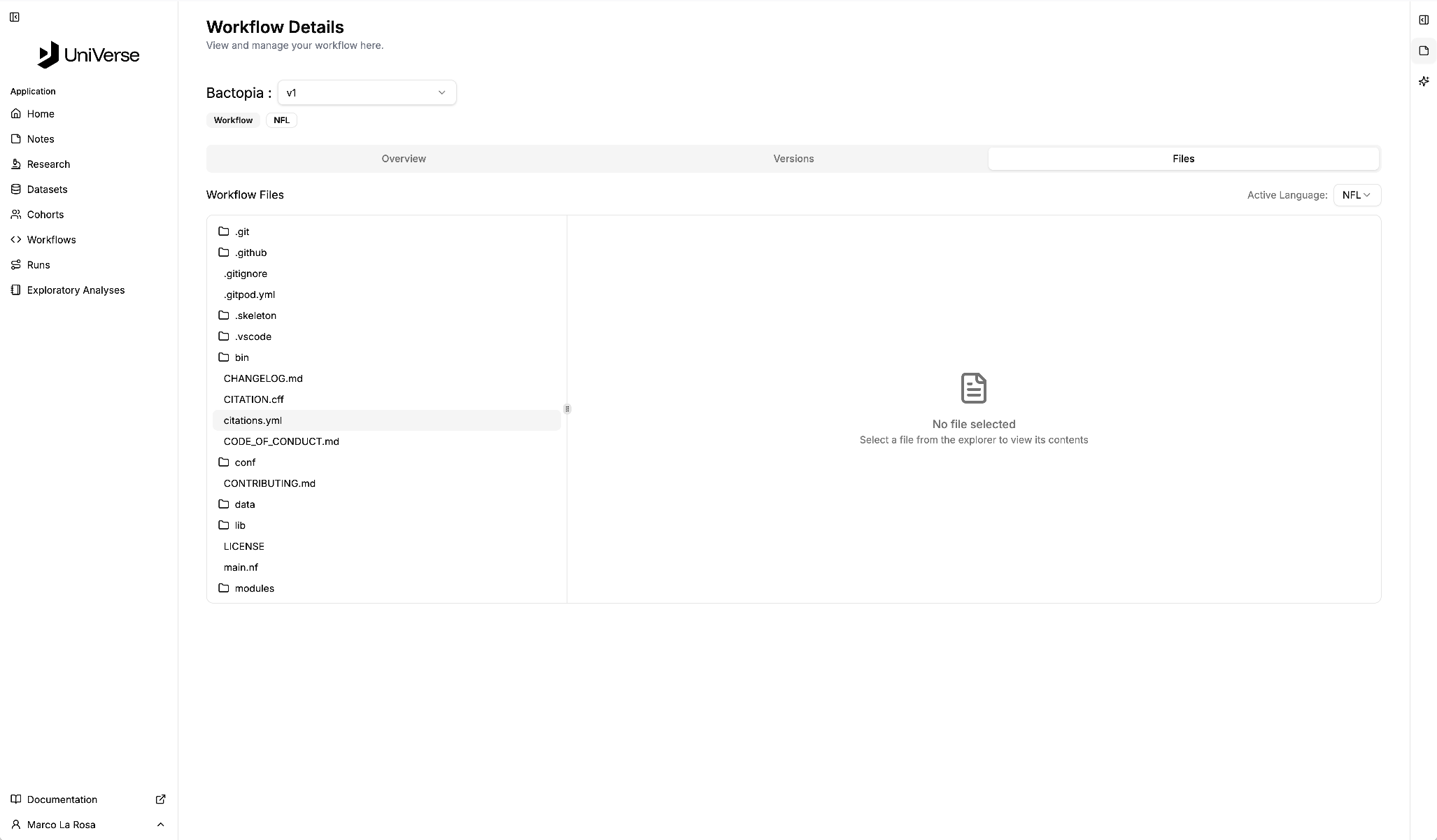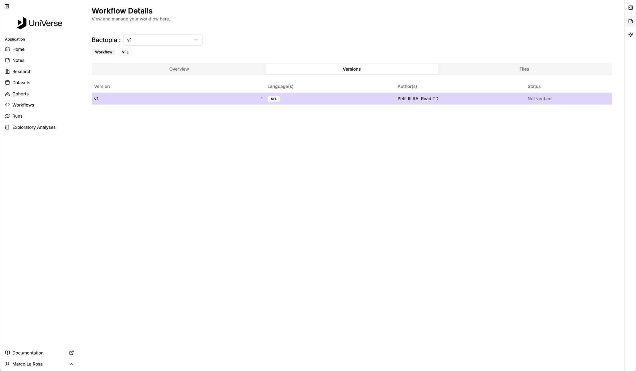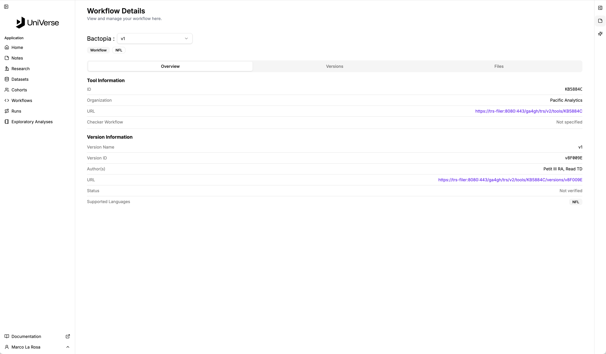 Workflow details are organised into different tabs containing Overview, Versions, and Files: